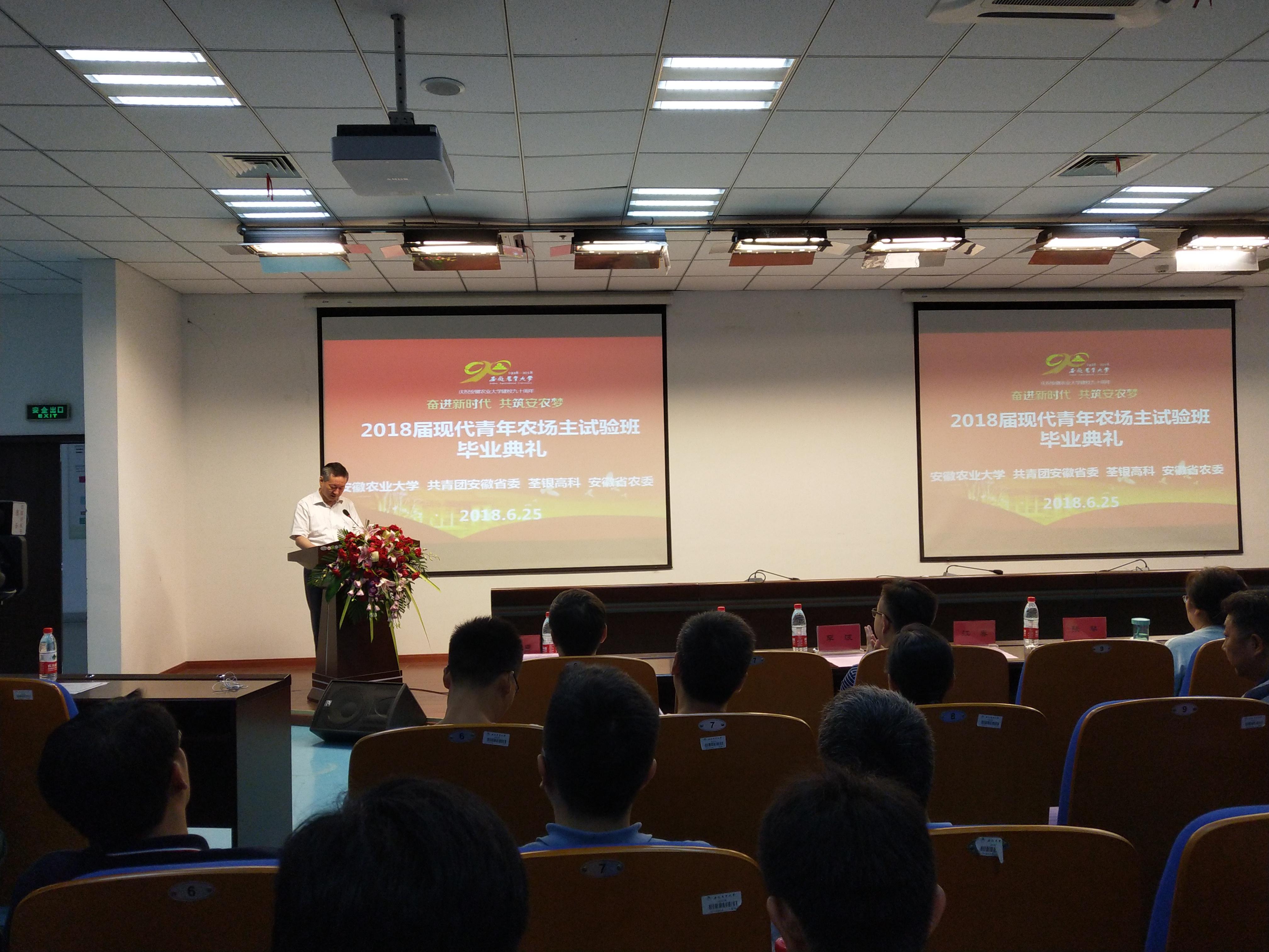 ??? 2018年6月25日上午,2018屆團校企“現(xiàn)代青年農(nóng)場主”荃銀創(chuàng)新創(chuàng)業(yè)試驗班畢業(yè)典禮在安徽農(nóng)業(yè)大學舉行。安徽農(nóng)業(yè)大學黨委書記江春,共青團安徽省委員會副書記李波、荃銀高科董事長張琴出席畢業(yè)典禮。安徽農(nóng)業(yè)大學副校長馬傳喜主持畢業(yè)典禮。巽風湖創(chuàng)業(yè)孵化基地總經(jīng)理佘良東、荃銀高科定遠創(chuàng)業(yè)孵化基地負責人羅干以及安徽農(nóng)業(yè)大學相關處室、學院等單位主要負責人、部分現(xiàn)代青年農(nóng)場主試驗班的任課老師、2018屆現(xiàn)代青年農(nóng)場主試驗班畢業(yè)生、2015級和部分2016級現(xiàn)代青年農(nóng)場主試驗班學員參加了畢業(yè)典禮。