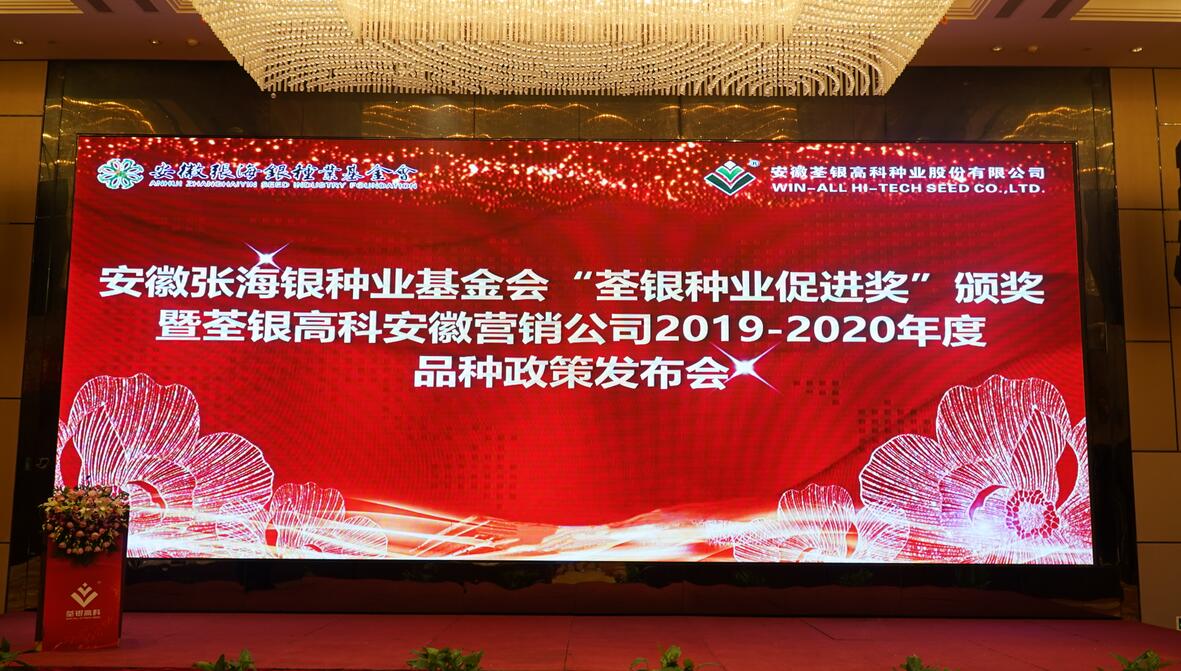 ??? 深耕種業(yè),不忘初心。8月19-20日,安徽張海銀種業(yè)基金會2019年“荃銀種業(yè)促進獎”頒獎大會暨荃銀高科安徽營銷公司品種政策發(fā)布會在安徽蕪湖隆重召開。安徽省種子管理總站副站長劉根、中國貿(mào)促會蕪湖市支會會長常拯、蕪湖市種子管理站副站長陳煒平、安徽荃銀高科種業(yè)股份有限公司副董事長兼總經(jīng)理張琴、常務副總經(jīng)理兼營銷總監(jiān)王玉林、安徽張海銀種業(yè)基金會秘書長張彤、建設銀行、益海嘉里等單位相關領導及安徽、江蘇、河南等省近200位種業(yè)精英們參會。